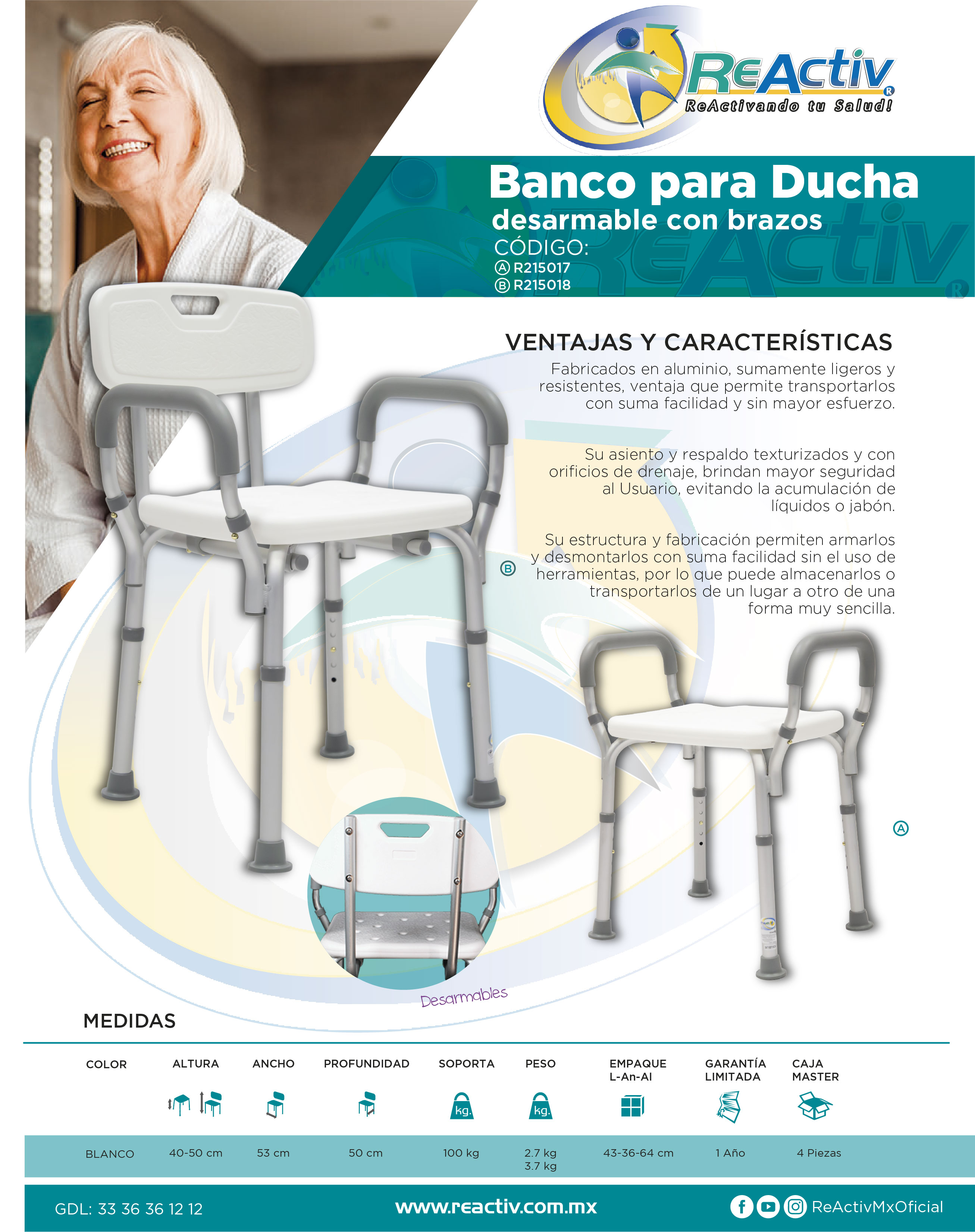 Banco para Ducha ReActiv de Aluminio sin Respaldo y con Brazos Desarmables, Blanco