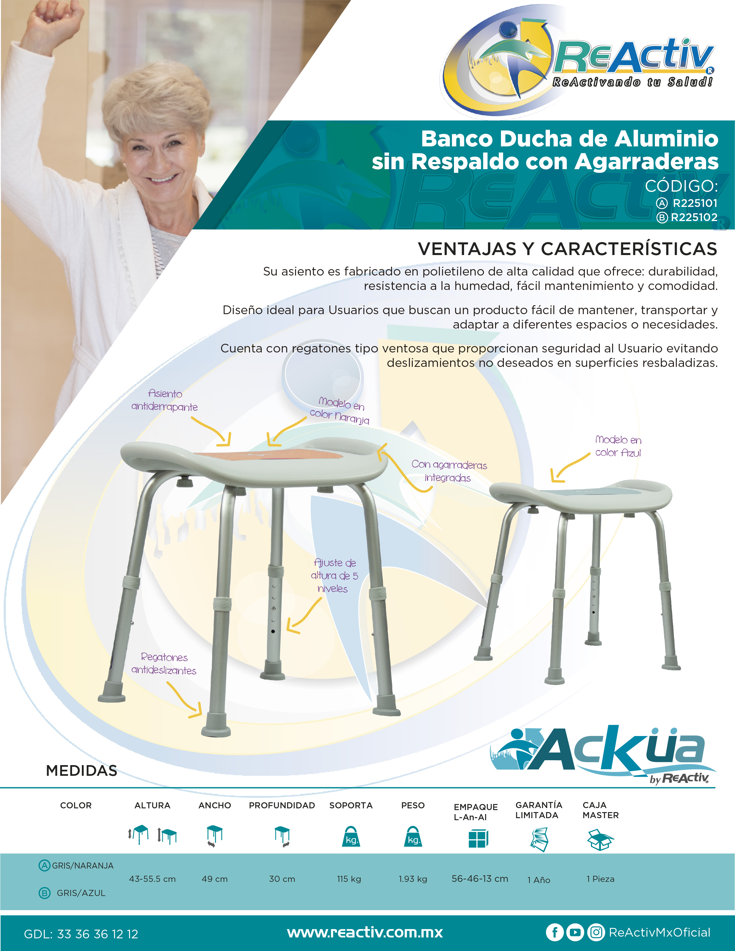 Banco Ducha de Aluminio sin Respaldo con Agarraderas Integradas, Color Gris/Naranja