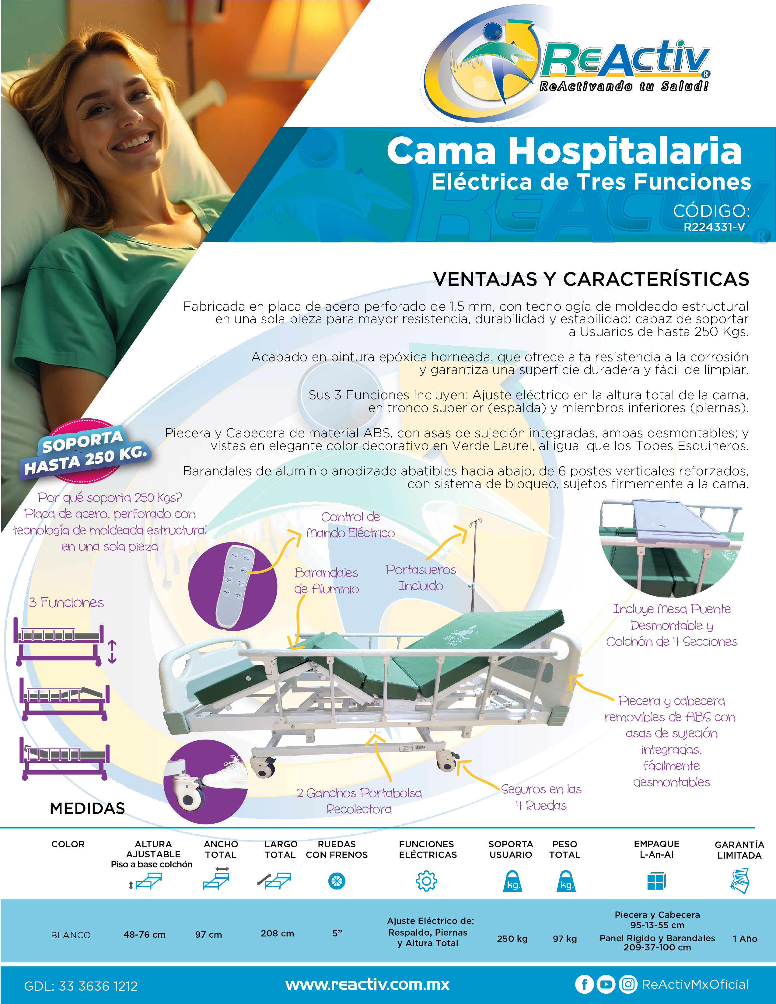 Cama Hospitalaria Eléctrica ReActiv Serie 7000, 3 Funciones, Piecera y Cabecera de ABS Desmontables, Barandales de Aluminio de 6 Barras Abatibles, Ruedas de 125 mm con Freno, Incluye Porta Suero Telescópico y Gancho para Bolsa de Fluidos, Capa