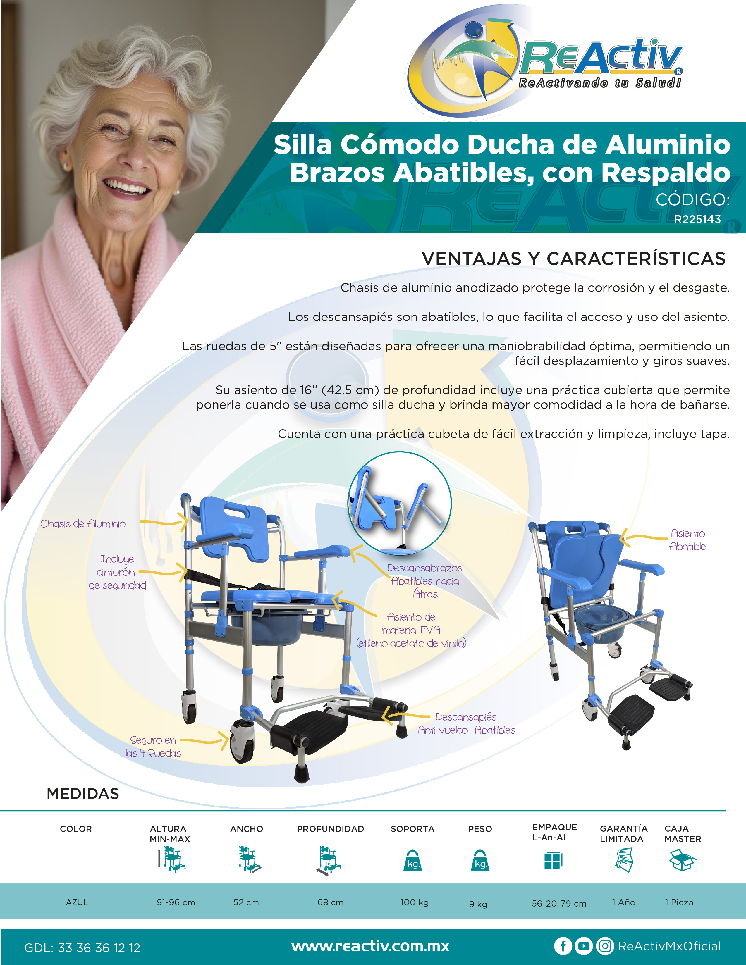 Silla Cómodo Ducha ReActiv Brazos Abatibles con Respaldo, Color Azul