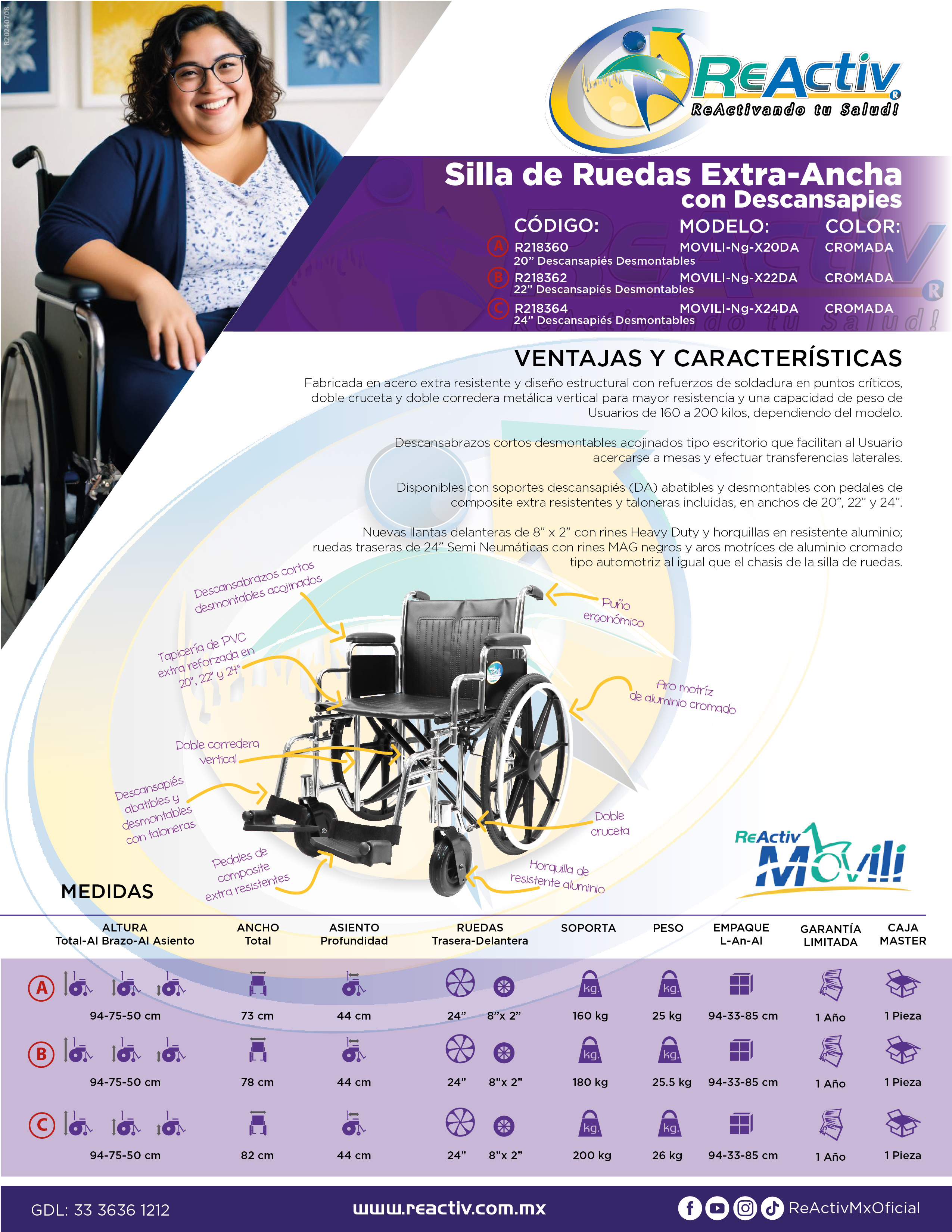 • Disponibles con soportes descansapiés (DA) abatibles y desmontables con pedales de composite extra resistentes y taloneras incluidas, ancho de 20, 22 y 24 pulgadas.