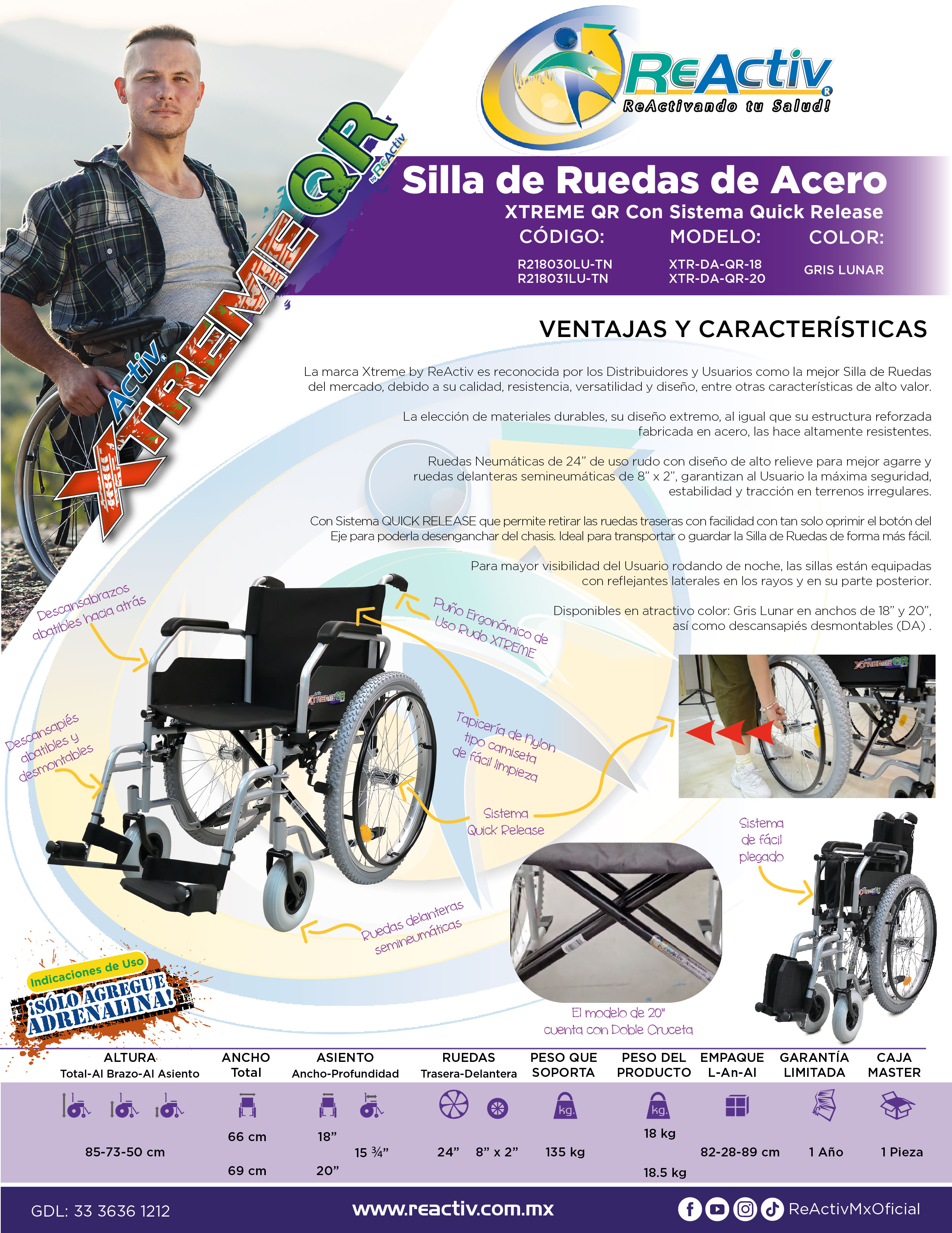 Xtreme QR de Acero  con Sistema Quick Release, Asiento de 18" con Brazos Flip Up, Descansapies Desmontables, Rueda Delantera de 8x2", Rin de Aluminio, Rueda Neumática, Tapicería Nylon, Gris Lunar