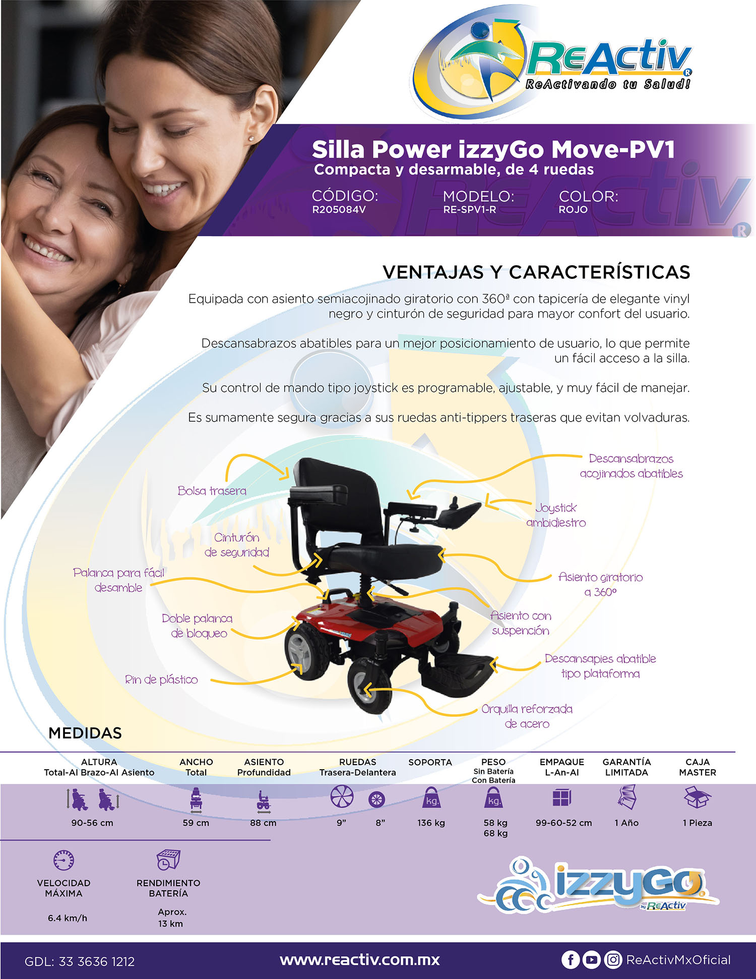 Silla Power izzyGo Move-PV1 Compacta y Desarmable, de 4 Ruedas, Roja